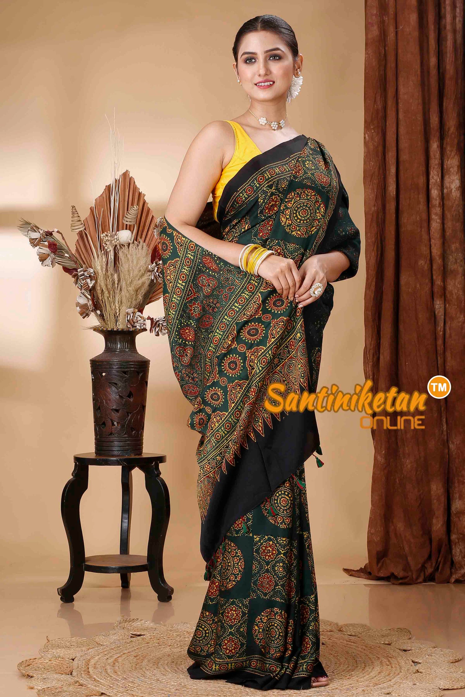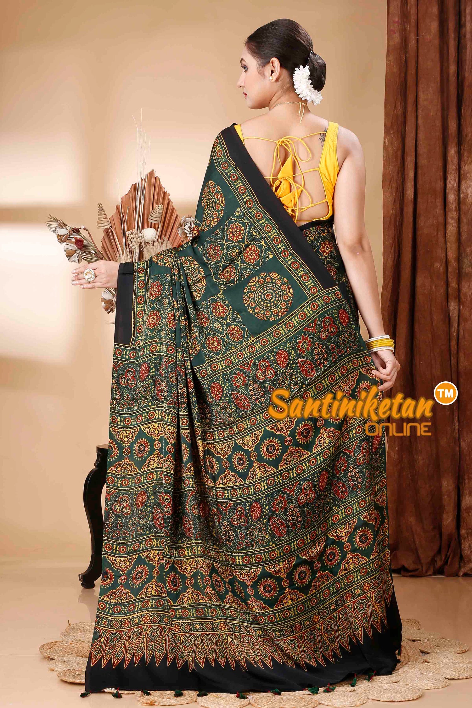 Ajrakh is printed as single sided and double sided. Traditional 'Ajrakh' involves various stages of dyeing and resist printing using natural dyes and mordants. Indigo and madder are the primary colours that are used for dyeing. The resist and some colours are printed on the cloth using carved wooden blocks. These blocks are carved with intricate symmetrical patterns so that the same block can be used for both sides of the cloth. Earlier specialist wood carvers made these wooden blocks.