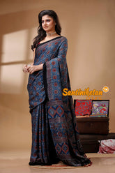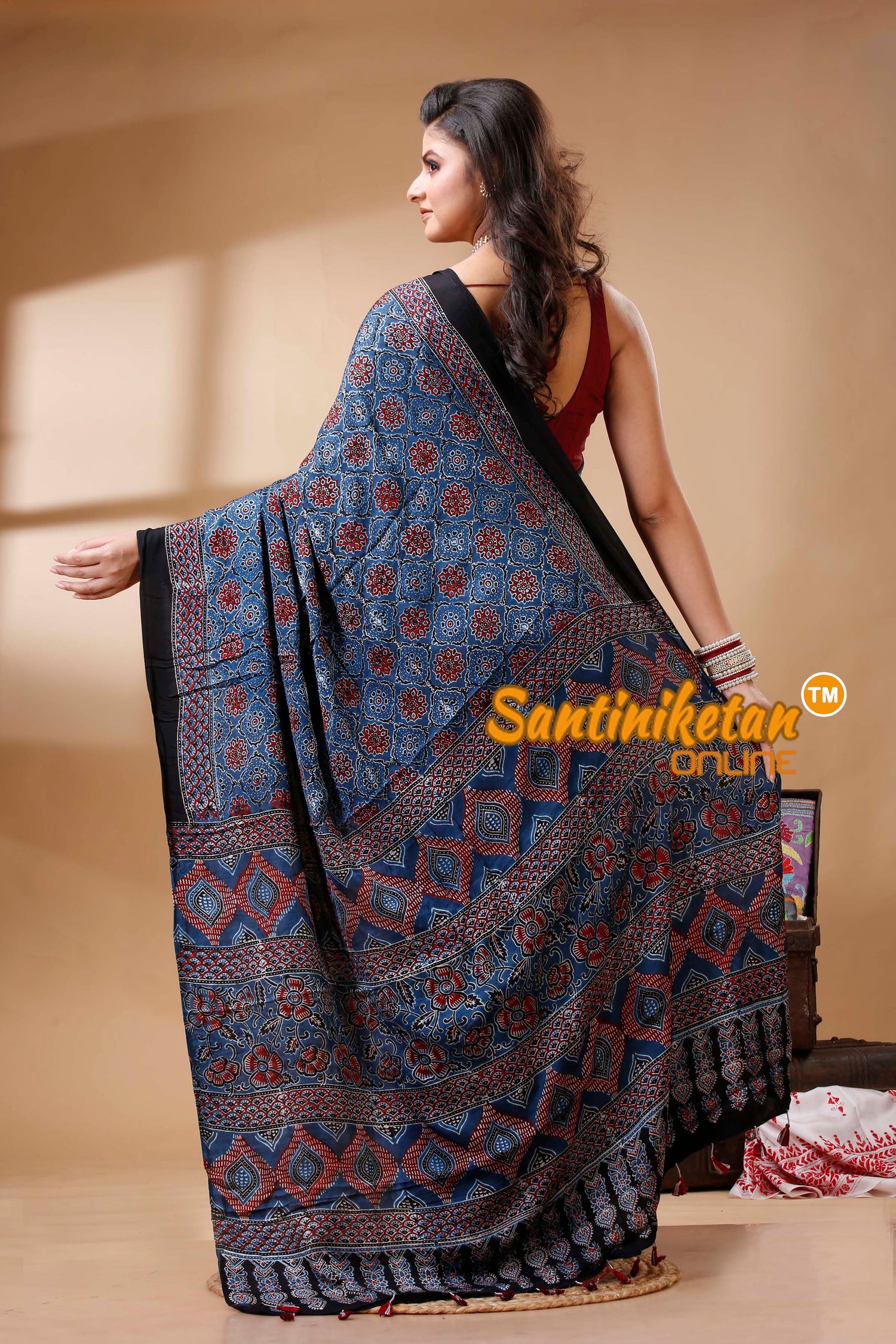Ajrakh is printed as single sided and double sided. Traditional 'Ajrakh' involves various stages of dyeing and resist printing using natural dyes and mordants. Indigo and madder are the primary colours that are used for dyeing. The resist and some colours are printed on the cloth using carved wooden blocks. These blocks are carved with intricate symmetrical patterns so that the same block can be used for both sides of the cloth. Earlier specialist wood carvers made these wooden blocks.