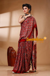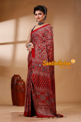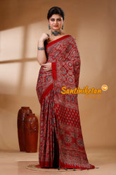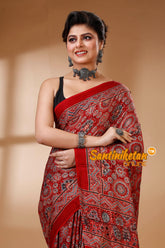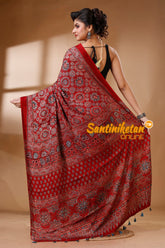 Ajrakh is printed as single sided and double sided. Traditional 'Ajrakh' involves various stages of dyeing and resist printing using natural dyes and mordants. Indigo and madder are the primary colours that are used for dyeing. The resist and some colours are printed on the cloth using carved wooden blocks. These blocks are carved with intricate symmetrical patterns so that the same block can be used for both sides of the cloth. Earlier specialist wood carvers made these wooden blocks.