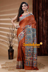 Exclusively Handcrafted Madhubani Saree. Is Made On 100% Pure Ghicha-Tussar Silk. The Madhubani Saree represent the Art Of Madhubani or Mithila. This Beautiful Art Practiced In The Mithila Region Of India And Nepal. Painting Is Done With Fingers, Twigs, Brushes, Nib-Pens, And Matchsticks, Using Natural Dyes And Pigments, And Is Characterized By Eye-catching Geometrical Patterns. There Is Ritual Content For Particular Occasions, Such As Birth Or Marriage, And Festivals, Such As Holi, Surya Shashti, Kali Puja, Upanayana, Durga Puja.