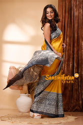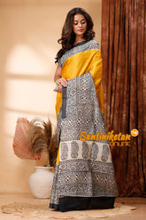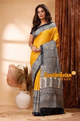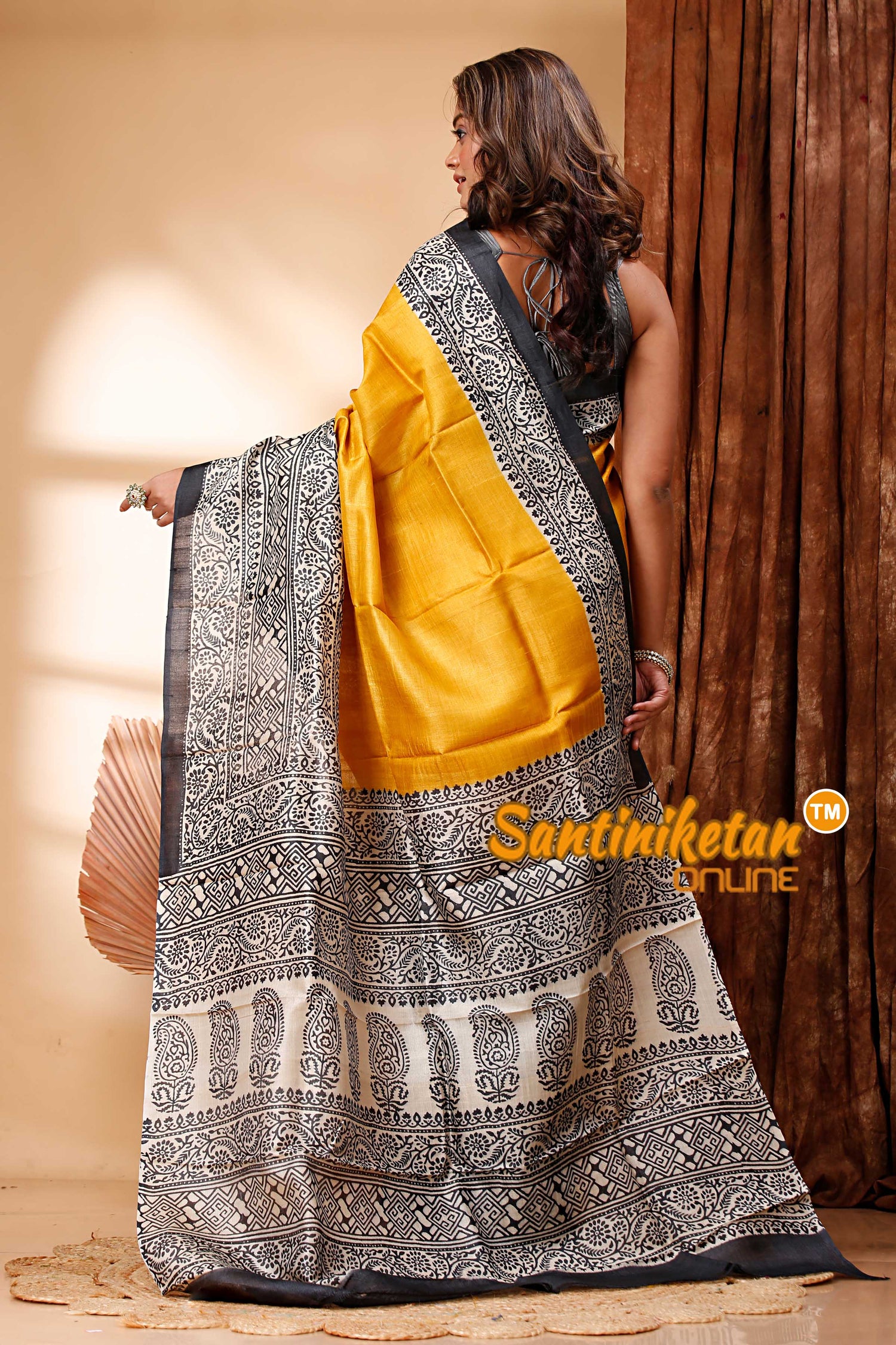 Pure Tussar Hand Block Painted Saree Each saree is carefully hand block painted, ensuring unique and intricate designs. The pure tussar fabric is sourced from the finest silk-producing regions, making it lightweight, breathable, and pleasant to the touch. It's a luxurious addition to any wardrobe.