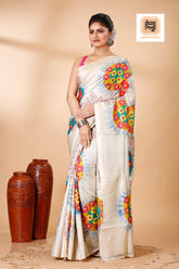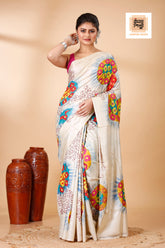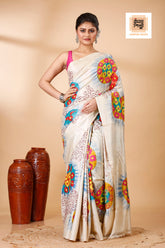 Experience the elegance of the Gachi Tussar saree, featuring intricate multicolor thread work that highlights abstract lines and a sunrising flower motif. Crafted with expert Kantha stitch techniques, this saree combines traditional artistry with contemporary design, offering a refined drape and rich texture. Ideal for special occasions, it brings a sophisticated charm to your wardrobe while showcasing exquisite craftsmanship.