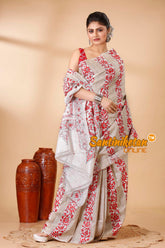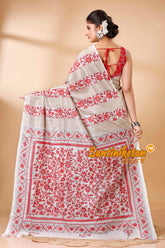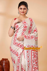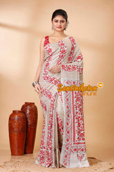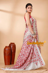 This gorgeous saree is handcrafted using pure Katan and Ketiya Tussar silk, featuring beautiful stripe patterns and traditional Kantha stitch work. Its high-quality materials and intricate stitching make it a timeless and durable addition to your wardrobe, perfect for showcasing your sophisticated taste and cultural appreciation.