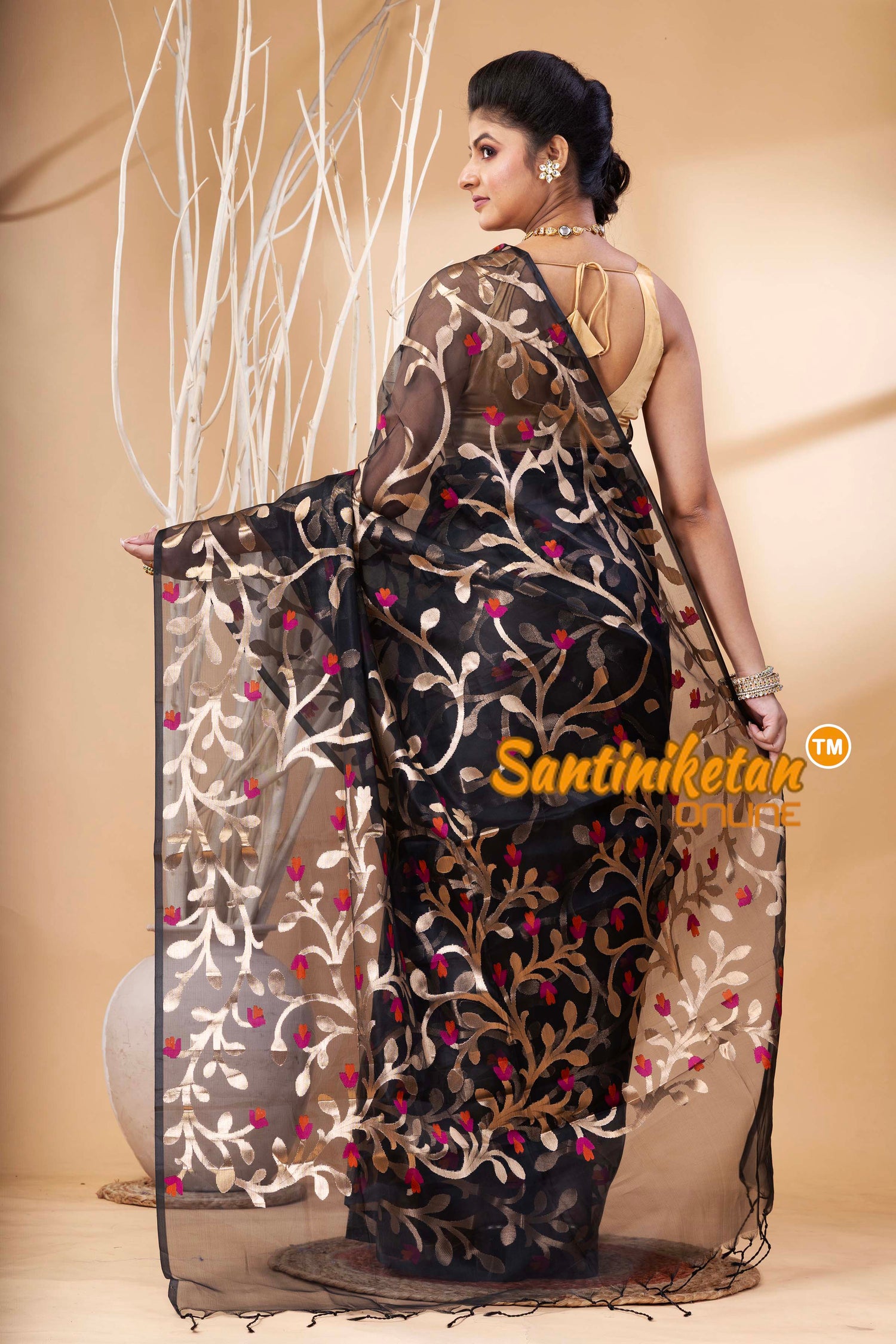 The Resham Maslin Jamdani Saree combines lightweight maslin fabric with detailed resham silk embroidery. Its traditional handwoven patterns reflect rich Indian heritage, offering both comfort and elegance. Ideal for special occasions, this saree features a graceful drape and lasting quality, making it a valuable piece of authentic craftsmanship.