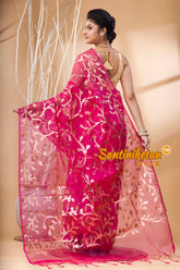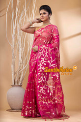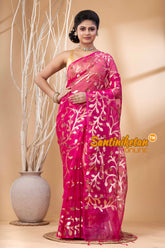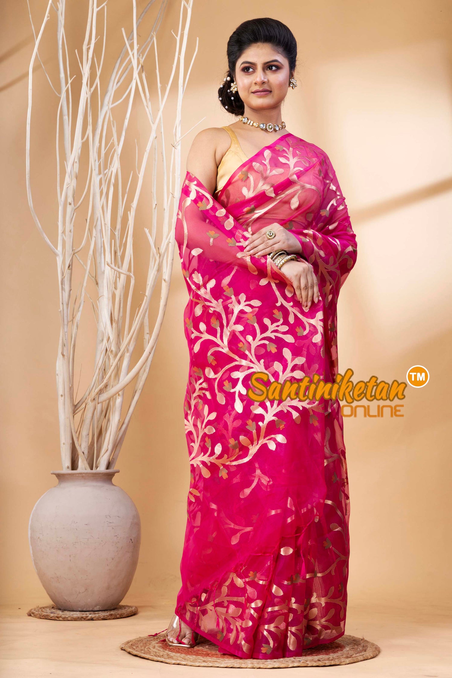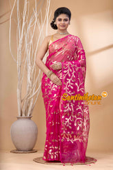 The Resham Maslin Jamdani Saree combines lightweight maslin fabric with detailed resham silk embroidery. Its traditional handwoven patterns reflect rich Indian heritage, offering both comfort and elegance. Ideal for special occasions, this saree features a graceful drape and lasting quality, making it a valuable piece of authentic craftsmanship.