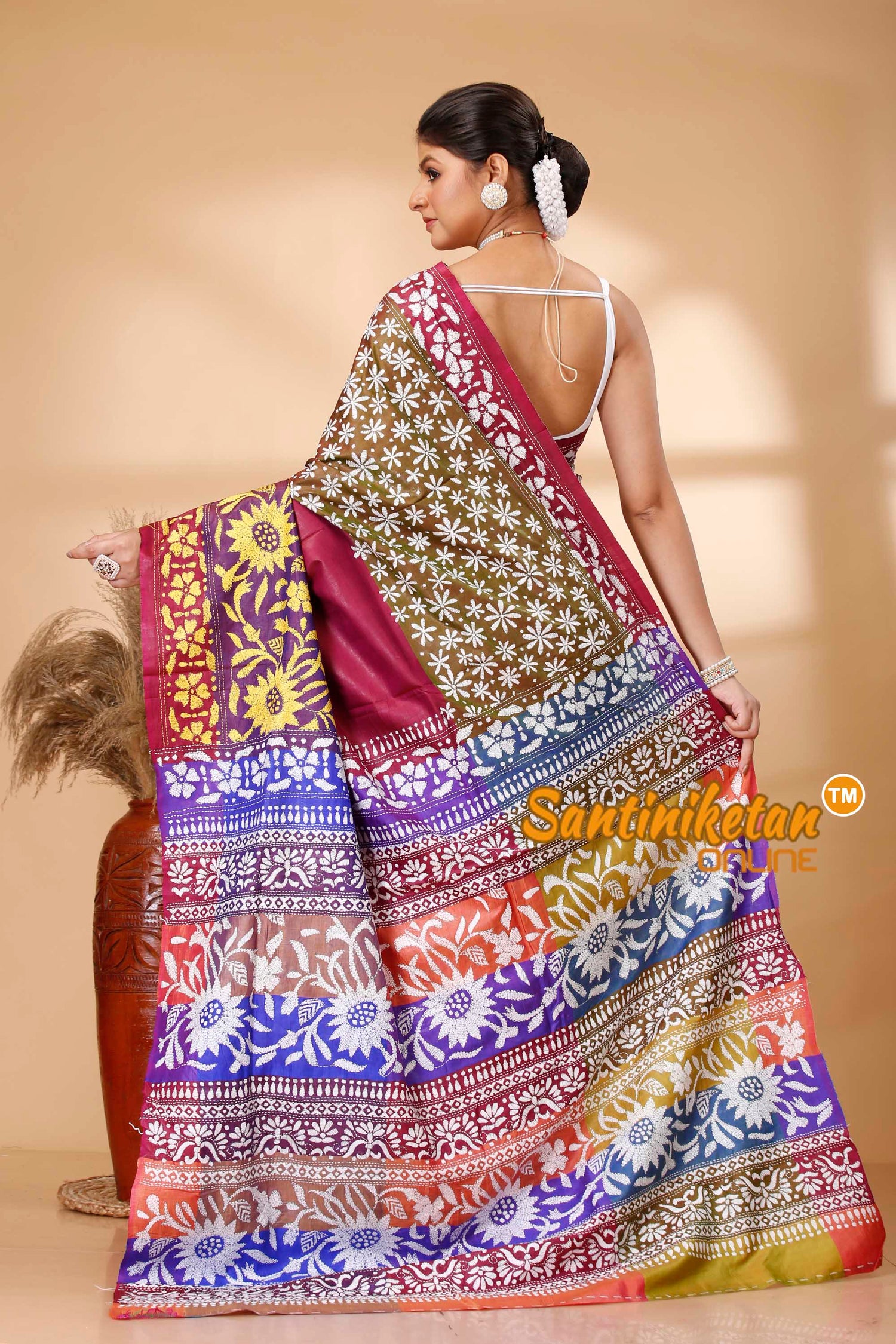 Bishnupuri (Katan) Silk Kantha Stitch Saree Expertly crafted and rich in cultural heritage, the Bishnupuri (Katan) Silk Kantha Stitch Saree is a must-have for any wardrobe. Made from the highest quality silk and brought to life through intricate kantha stitching, this saree is a testament to the beauty and artistry of traditional Indian garments.