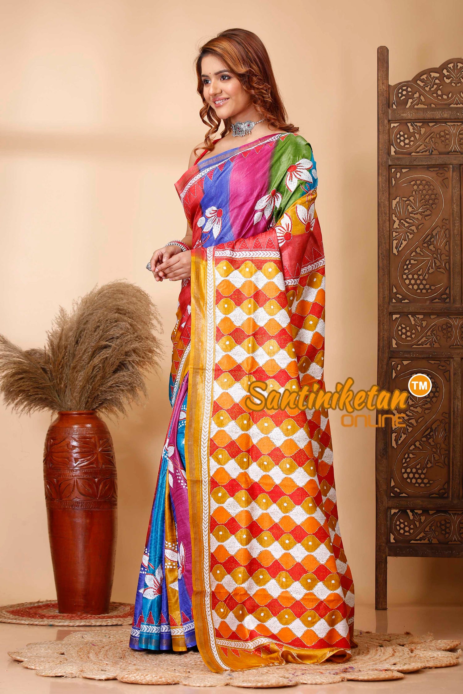 Pure Dye Tussar Silk Kantha Stitch Saree This saree is made with 100% pure high-quality Dye Tussar silk, known for its exceptional softness and stunning texture.