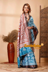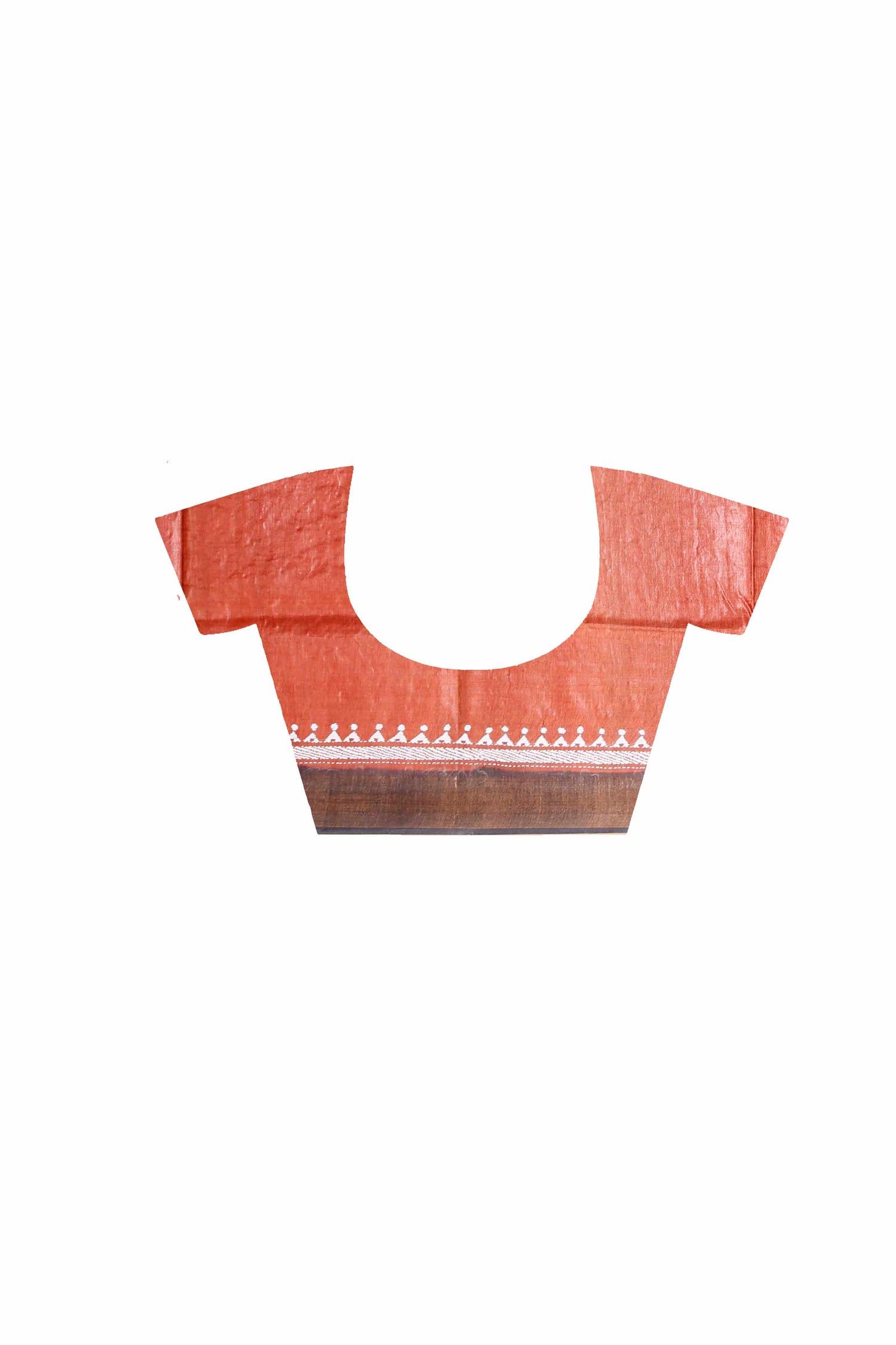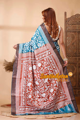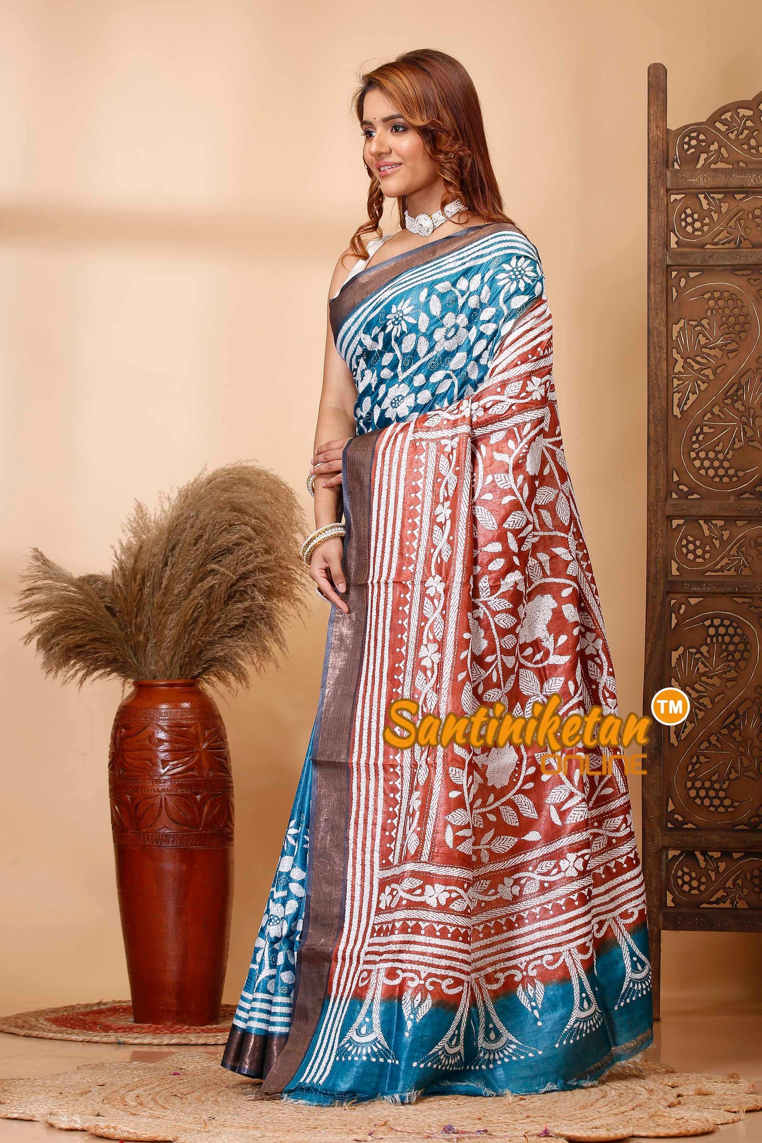 Made from 100% pure tussar silk, this saree features a traditional zari border and delicate kantha stitch detailing. This luxurious fabric is known for its softness and durability, making it a timeless addition to any wardrobe. Elevate your style with this expertly-crafted saree that combines traditional techniques with modern design.