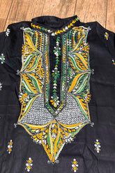 Crafted from pure black cotton, this Panjabi features intricate Kantha hand embroidery that highlights traditional craftsmanship. The breathable fabric ensures comfort in warm climates, while the detailed stitching adds a unique, artisanal touch. Ideal for those seeking a blend of classic style and cultural heritage in their wardrobe.