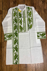 This white cotton Panjabi features exquisite Jamdani patchwork, blending traditional craftsmanship with breathable fabric for superior comfort. Ideal for formal and festive occasions, its lightweight cotton ensures ease of wear while the intricate Jamdani detailing adds a refined, elegant touch to your wardrobe. Perfect for those who appreciate authentic artisanal textiles combined with modern style.