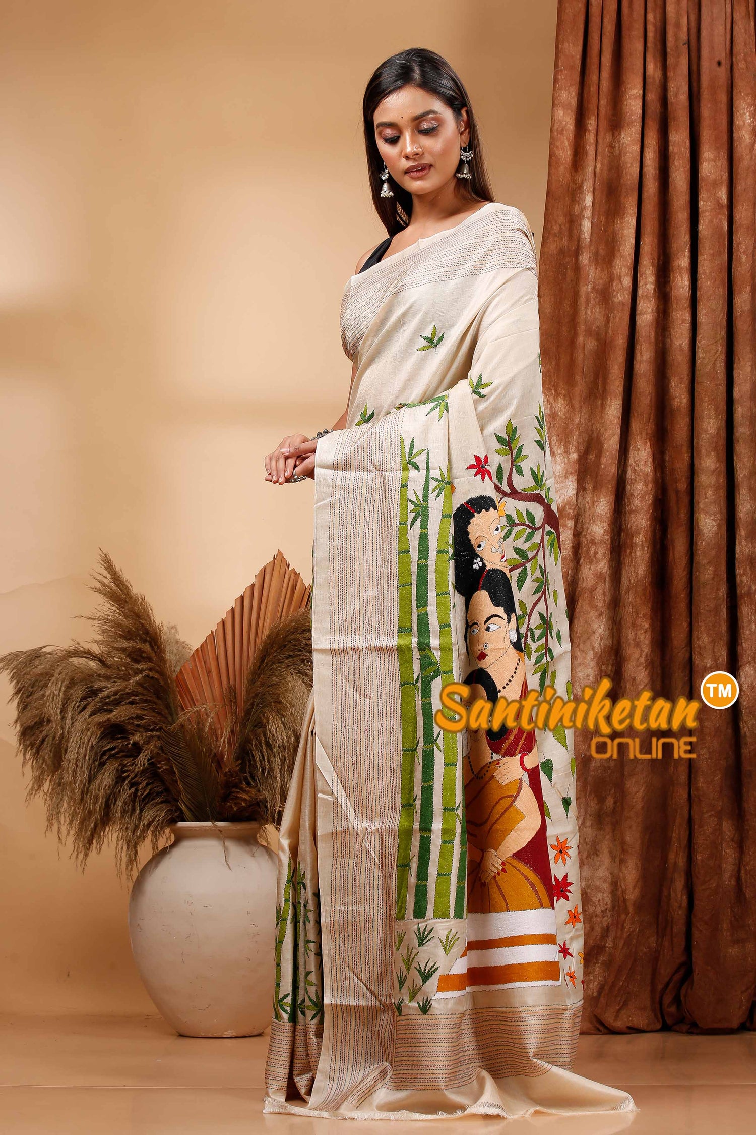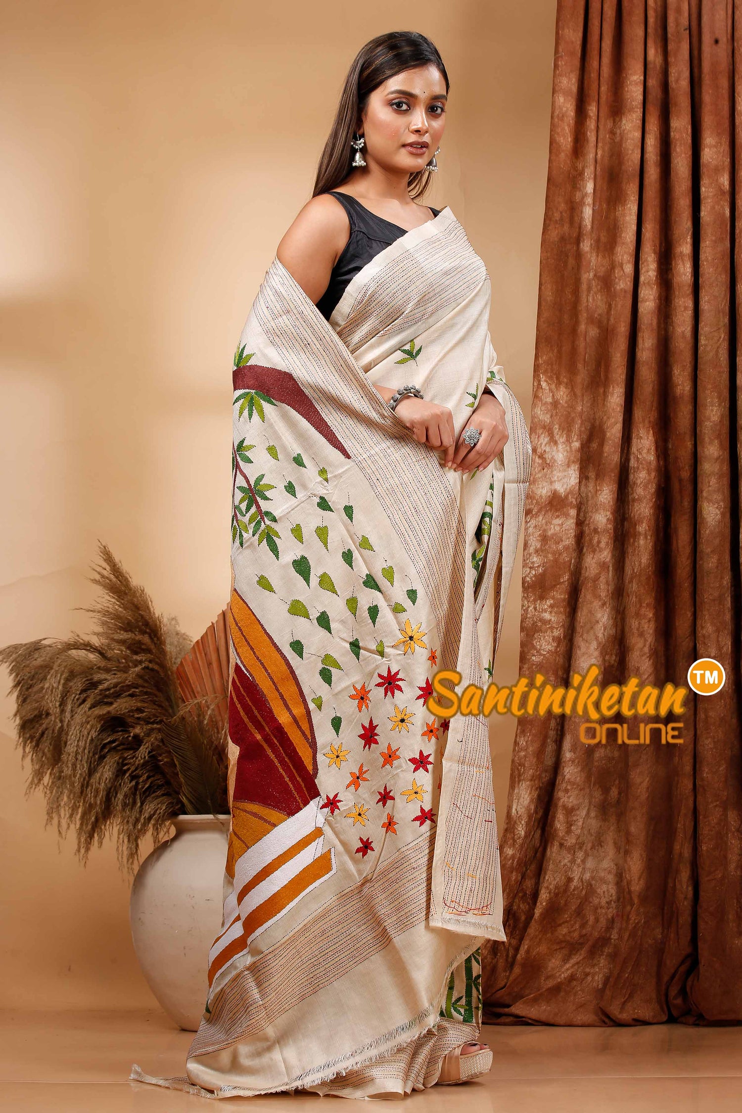 Pure Gachi Tussar Silk Kantha Stitch Saree
