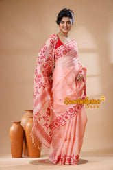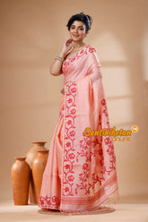This Pure Tussar Jamdani Saree represents the pinnacle of traditional Indian textile artistry. Woven from lustrous tussar silk, known for its natural golden sheen and durability, the saree features the distinctive jamdani technique—a labor-intensive supplementary weft method that creates intricate, raised patterns across the fabric. Each motif is meticulously hand-woven, ensuring no two pieces are identical. The breathable nature of tussar silk makes it ideal for warm climates, while its weight and drape provide an elegant silhouette. This saree is suited for weddings, festivals, and formal occasions where authentic craftsmanship and timeless sophistication are valued. A testament to centuries-old weaving traditions, it's an investment piece for discerning collectors of fine Indian textiles.
