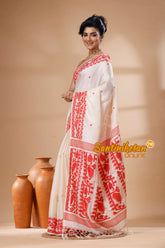 This Pure Tussar Jamdani Saree represents the pinnacle of traditional Indian textile artistry. Woven from lustrous tussar silk, known for its natural golden sheen and durability, the saree features the distinctive jamdani technique—a labor-intensive supplementary weft method that creates intricate, raised patterns across the fabric. Each motif is meticulously hand-woven, ensuring no two pieces are identical. The breathable nature of tussar silk makes it ideal for warm climates, while its weight and drape provide an elegant silhouette. This saree is suited for weddings, festivals, and formal occasions where authentic craftsmanship and timeless sophistication are valued. A testament to centuries-old weaving traditions, it's an investment piece for discerning collectors of fine Indian textiles.